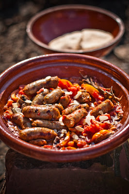 But a great thing. The first allotment BBQ of the year. And this one was slightly different. Sausages cooked on the BBQ, in the tagine, with onions, garlic, cumin, ras el hanout, tomatoes, mushrooms, orange pepper and flaked almonds. Then we placed the tagine on a brick in the centre and all ate from the one plate, scooping with pitta bread and drinking chilled white wine from a plastic cup. Great summer days indeed.